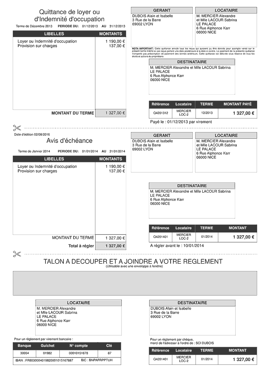Voici l'exemple d'un document regroupant une quittance et un avis d'échéance sur une seule page. En regroupant toutes ces informations ensemble, vous économisez des frais de papier, d'encre et d'envoi postal. Toutes les données importantes y figurent, y compris si besoin du talon à découper et de la note en bas de page.