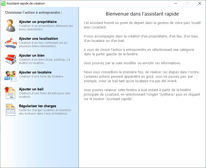 Afin de vous faire gagner du temps et vous simplifier l'enregistrement des informations, LocaGest propose des assistants pour saisir plus rapidement les données nécessaires à l'exploitation de votre gestion locative.