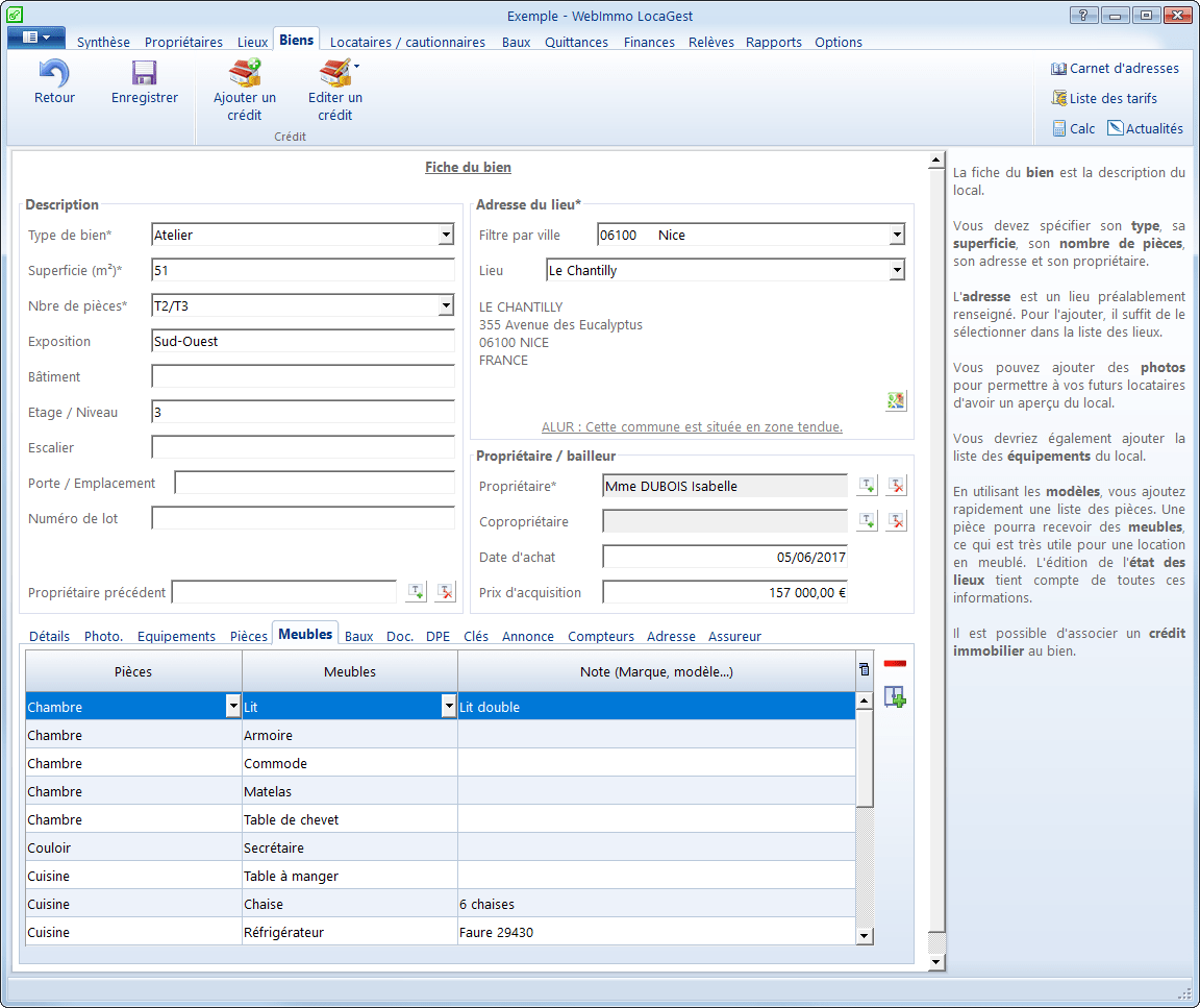 Cette rubrique recense la liste de vos biens. Elle permet de gérer les locaux qui seront disponibles à la location. Dans la fiche du bien, il est possible de spécifier des informations particulières comme son type et sa surface qui seront par la suite très utiles.