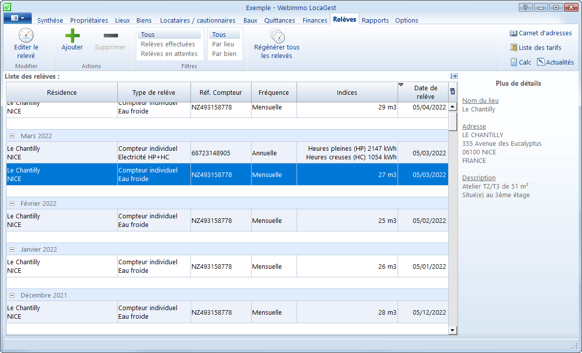L'onglet des relèves permet de gérer les index de vos compteurs pour vos lieux (compteurs généraux d'immeubles) ou pour vos biens (compteurs individuels).